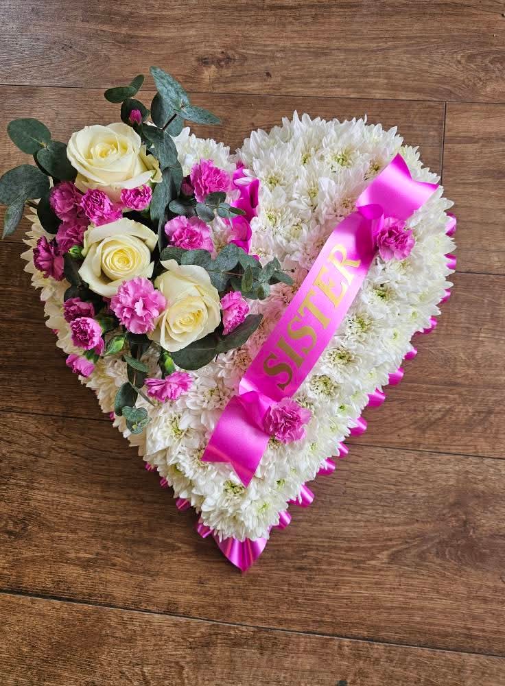 Heart – Small 30cm £65, Medium 35cm £85, Large 40cm £95 Choose colour of ribbon and over spray (Based white)
